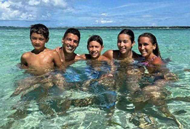 最近,苏亚雷斯带着全家人前往海岛度假,享受夏日阳光和美好时光。苏亚雷斯依旧笑容满面,那标志性的大门牙依然吸引眼球。虽已是38岁的他,身着沙滩裤,上身赤裸,肌肉线条依然明显,展现出自律训练的成果。而他的妻子同样保养有加,身材窈窕、容颜俊美。三个孩子中,两个儿子更像苏亚雷斯,而女儿则更像妻子,同样容貌出众。